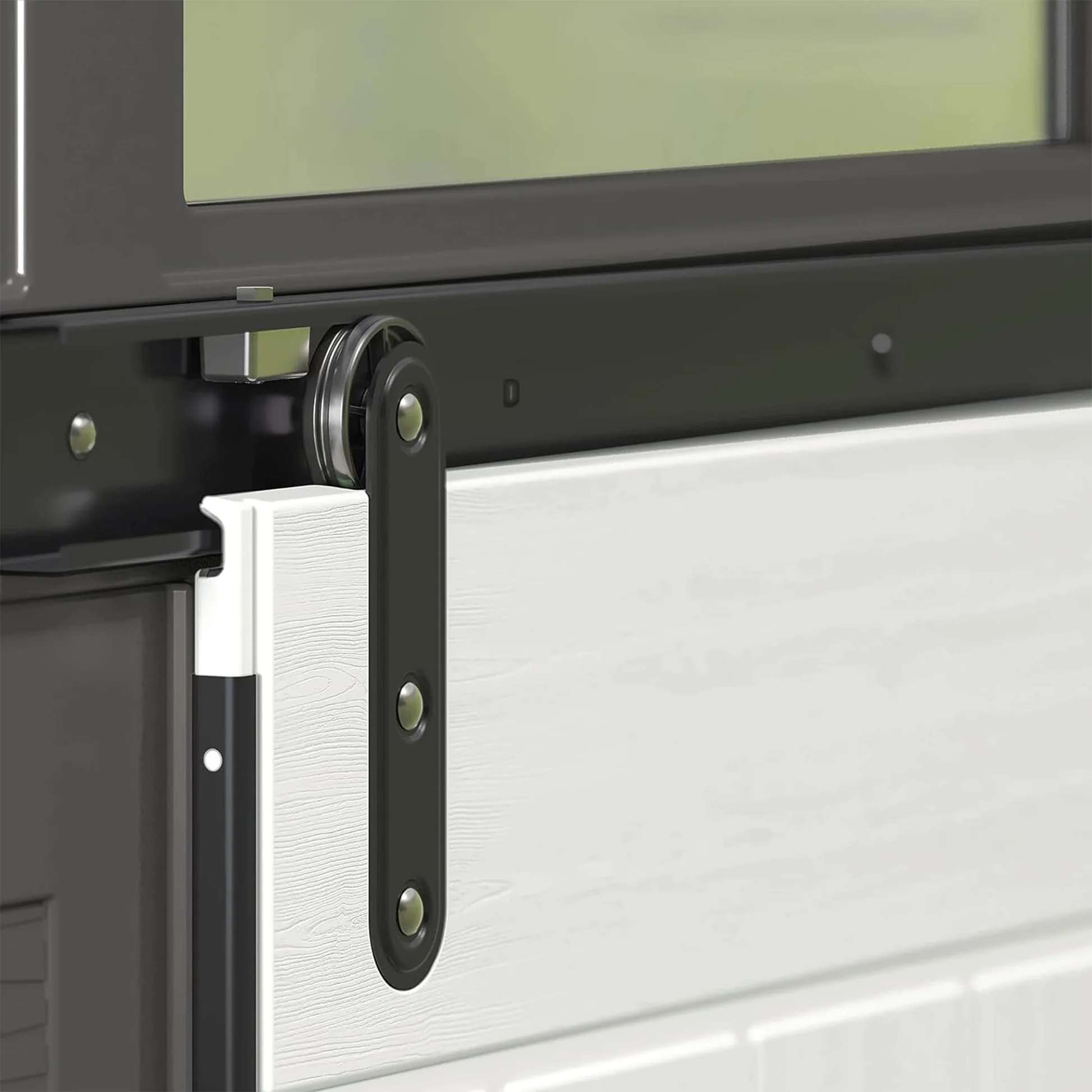The 10 ft. x 7 ft. Suncast® shed with a unique modern barn door feature is ideal for both its functionality